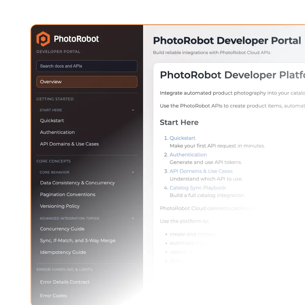 Direct your development teams to the PhotoRobot Developer Portal for the ultimate toolkit to build custom, highly scalable photography workflows. The PhotoRobot Cloud API provides a strict, standard-driven integration contract for engineering teams to ensure frictionless integration with enterprise-grade stability.