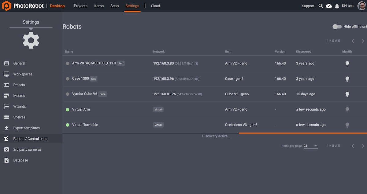In order to find the IP address of the Centerless Table or any PhotoRobot device, the PhotoRobot Locator app is integrated directly within CAPP. This allows for the easier search and identification of Control Units on the network without using external applications. Ensure you are using the most up-to-date version of CAPP to access this feature.